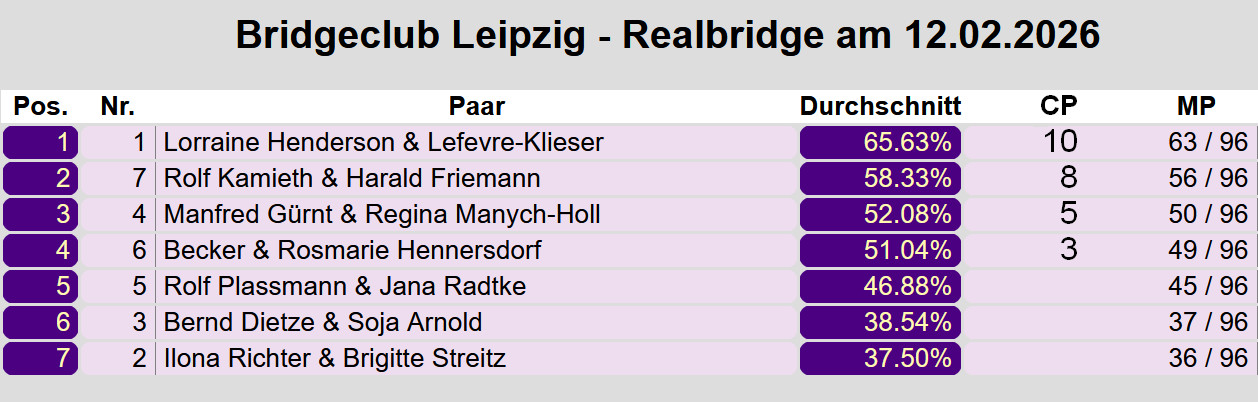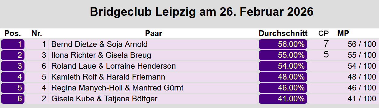 | Paarturnier | 12.02.2026 | Ergebnis | Details bei Realbridge | PBN-Datei |