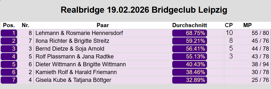 | Paarturnier | 19.02.2026 | Ergebnis | Details bei Realbridge | PBN-Datei |