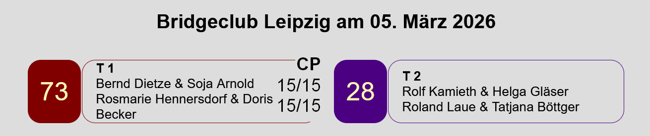 | Paarturnier | 05.03.2026 | Ergebnis | Details bei Realbridge | PBN-Datei |