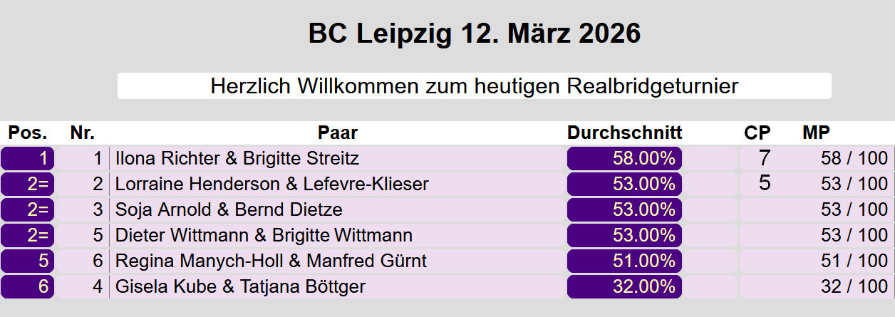| Paarturnier | 12.03.2026 | Ergebnis | Details bei Realbridge | PBN-Datei |