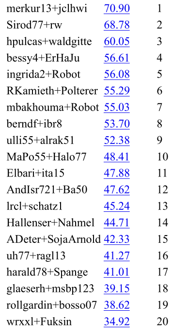 | Ergebnis laut BBO | Rang | Paar | % | CP | ||