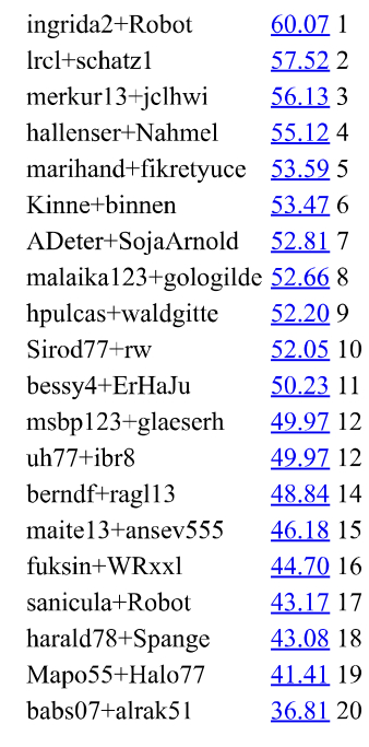 | Ergebnis laut BBO | Rang | Paar | % | CP | ||